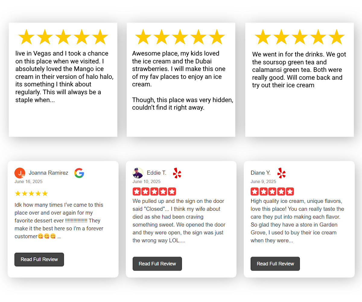 Display your best Google & Yelp reviews in elegant, modern cards with swipeable photos. Import automatically or add manually.